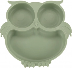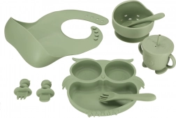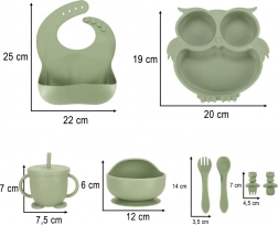 Praktisk og attraktivt silikone-sæt med service designet til børn. Indeholder alt, hvad dit barn har brug for til en komfortabel og sjov spisning. Uglemotivet i militærgrøn farve er ikke kun moderigtigt, men også en fornøjelse for alle små spisende.