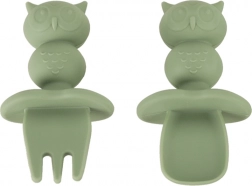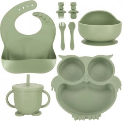 Silikone-sæt med service til børn med uglemotiv i militærgrøn farve