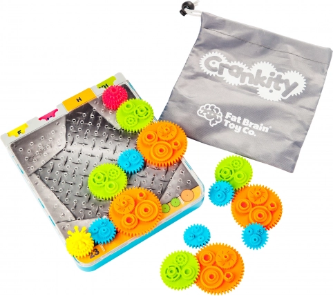 Oplev sjov med Crankity-puslespillet fra Fat Brain. Denne pakke tilbyder interaktiv sjov med 14 tandhjul, et håndsving og 40 puslespil opdelt i 4 sværhedsgrader.
