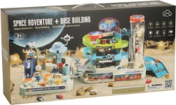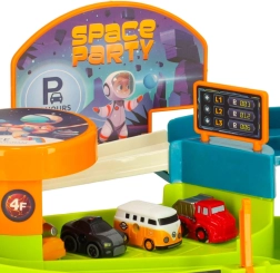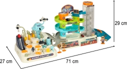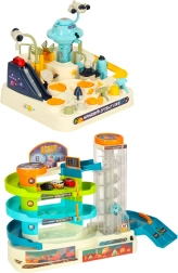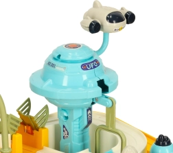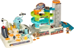 Den multifunktionelle kosmiske bilbane byder på dobbelt så meget spænding og legemuligheder. Med sine to spor er det muligt at lave to mindre kredsløb eller forbinde dem til én stor bane og se mini-bilerne suse gennem det kosmiske landskab. Den store bane er udstyret med en elektrisk elevator, der automatisk transporterer bilerne til toppen og sikrer uafbrudt underholdning. Den mindre bane indeholder interaktive elementer, som barnet selv skal betjene, hvilket involverer og udvikler deres manuelle færdigheder. Pakken indeholder seks køretøjer, inklusive en politibil og en cementblander, hvilket muliggør varieret leg.