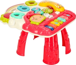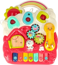 Et syvtangenters lille klaver, tandhjul, bogstaver, en hundehus-dør og en aftagelig telefon stimulerer sanserne og barnets finmotorik.