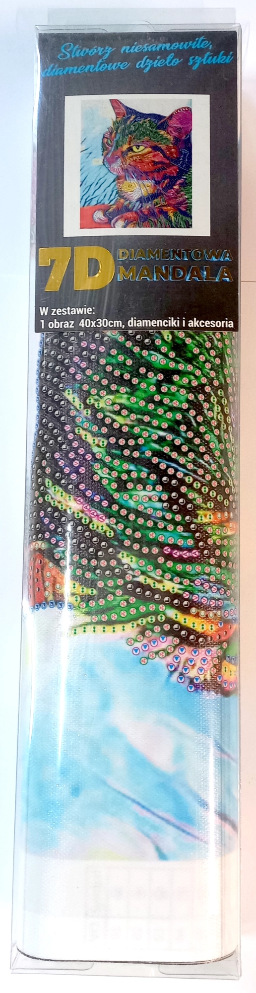Diamantmaleri – fremgangsmåde: Oversiden af lærredet er belagt med lim og dækket af en gennemsigtig film. Fjern filmen gradvist i sektioner i takt med, at du påfører stenene. Hvis hele filmen fjernes på én gang, kan det klæbrige lag blive snavset, og stenene vil måske ikke sidde så godt fast. Lærredet indeholder symboler, som er angivet i den medfølgende legend og henviser til den tilsvarende pose med sten markeret med et nummer. Hæld stenene fra den valgte pose i bakken. Tag voks i spidsen af pennen, så stenene nemt fæstner sig til pennen. Anbring stenene på billedet med pennen. Når en given farve er færdig, hældes stenene tilbage i posen, og fortsæt med den næste farve.