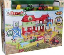 - Spillemåtte, bygning, stald, hånddreven kran, tank, stige, 2 traktorer med tilbehør, 2 figurer af landmænd, dyrefigurer (hest, gris, ko), indgangsport, hegn, skilte, vejviser og yderligere tilbehør