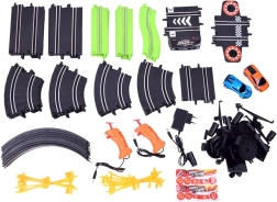 Sættet indeholder alle nødvendige elementer til racing, såsom lige strækninger, kurver, loops og banelagte markeringer.