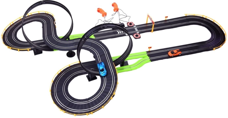 Racerbane med to loops på en længde af 787 cm giver hver chauffør masser af spændende sjov. Denne imponerende bane tillader løb for to og kræver ikke brug af batterier, da køretøjerne er drevet via en adapter.