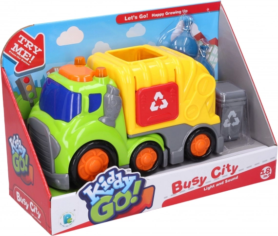Oplev sjov med Kiddy skraldebilen på 19,5 cm, som byder på lys- og lydeffekter, bevægelige døre og en åbnbar skraldespand. Tryk blot på knappen på taget af kabinen, og legen kan begynde! Der medfølger også friløbshjul for flydende kørsel og komplet tilbehør til realistisk leg.