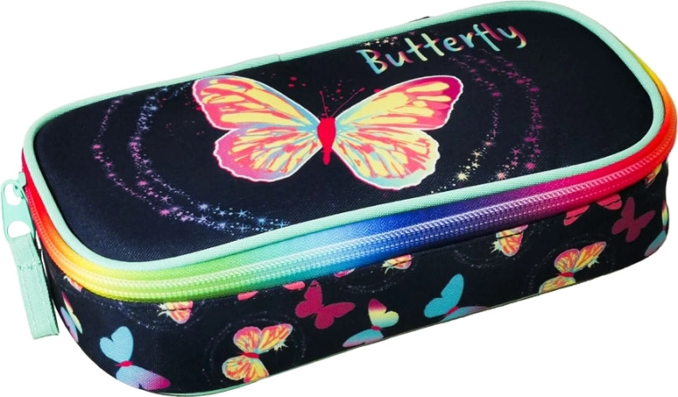 Skoleetuiet OXY Style Mini Sommerfugl er designet med fokus på funktionalitet og stil. Det er udstyret med en klap med solide stropper på begge sider, under hvilken der er rigelig plads til fri opbevaring af skriveredskaber eller andre småting.