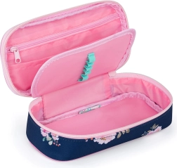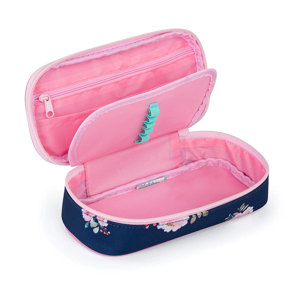 Dette etui er designet til overskuelig organisering af skoleudstyr. Det robuste design med faste lynlåse beskytter indholdet, mens klappen med elastiske stropper på begge sider holder penne, blyanter og tuscher sikkert på plads. Der er også en lille lynlåslomme til småting, og under klappen findes plads til frit at opbevare ting, du vil have lige ved hånden.