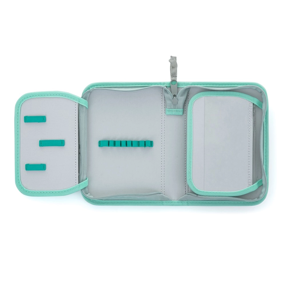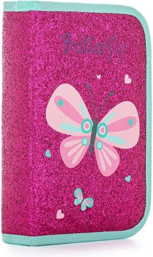 Det en-etagers skolepenalhus med palieteffekt og sommerfuglemotiv kombinerer et attraktivt look med praktisk indretning. Takket være de to flapper finder du let det, du søger, og skriveredskaberne bliver sikkert fastholdt i løkkerne. Gennemsigtige lommer på de indvendige flapper gør, at du altid har skemaet lige for øje.