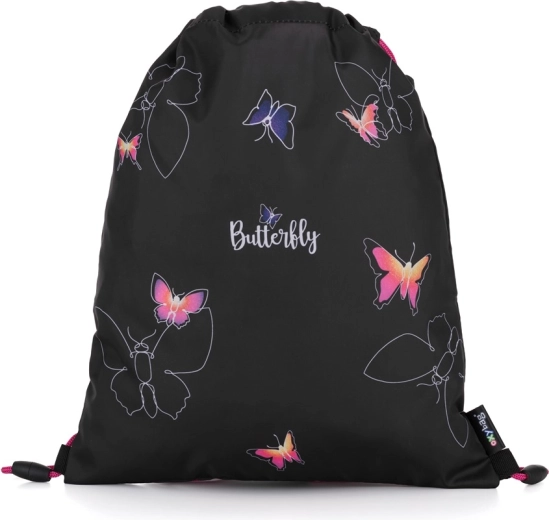 Det stilfulde Butterfly-motiv vil glæde ethvert barn, og takket være den smarte udformning kan posen bæres komfortabelt på ryggen eller nemt fastgøres til skoletasken. De kompakte mål sparer plads, men giver samtidig rigelig plads til gymnastiktøj eller skiftetøj/sko.