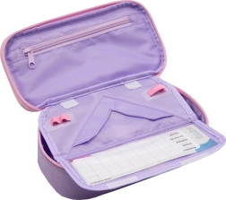 Indeni finder du en klap med seks holdere til de mest brugte kuglepenne og blyanter, en lukbar lomme til småting og et særskilt rum til lineal. De robuste lynlåse sikrer lang levetid og nem åbning.