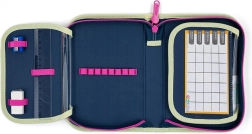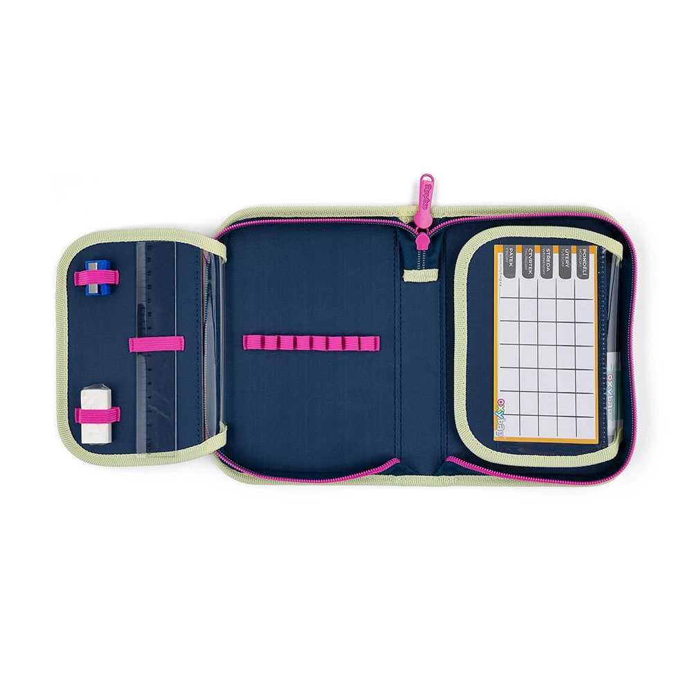Enkeltlags penalhus med to indvendige flapper giver fremragende organisering af skoleudstyr. Takket være 25 elastiske bånd har du altid blyanter, kuglepenne, viskelæder og lineal på plads. De gennemsigtige lommer på flapperne er ideelle til skoletidsskema eller noter.