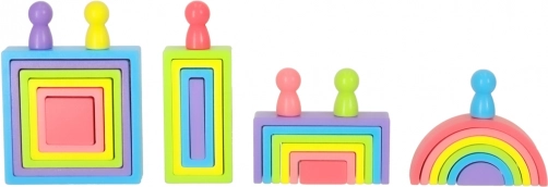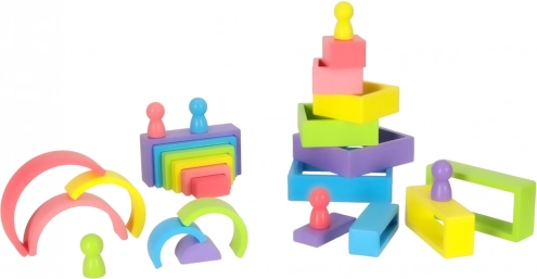 De farverige trædele motiverer børn til at bygge broer, tårne og regnbuekompositioner. De støtter fantasien og selvstændig udforskning takket være en åben legeform.