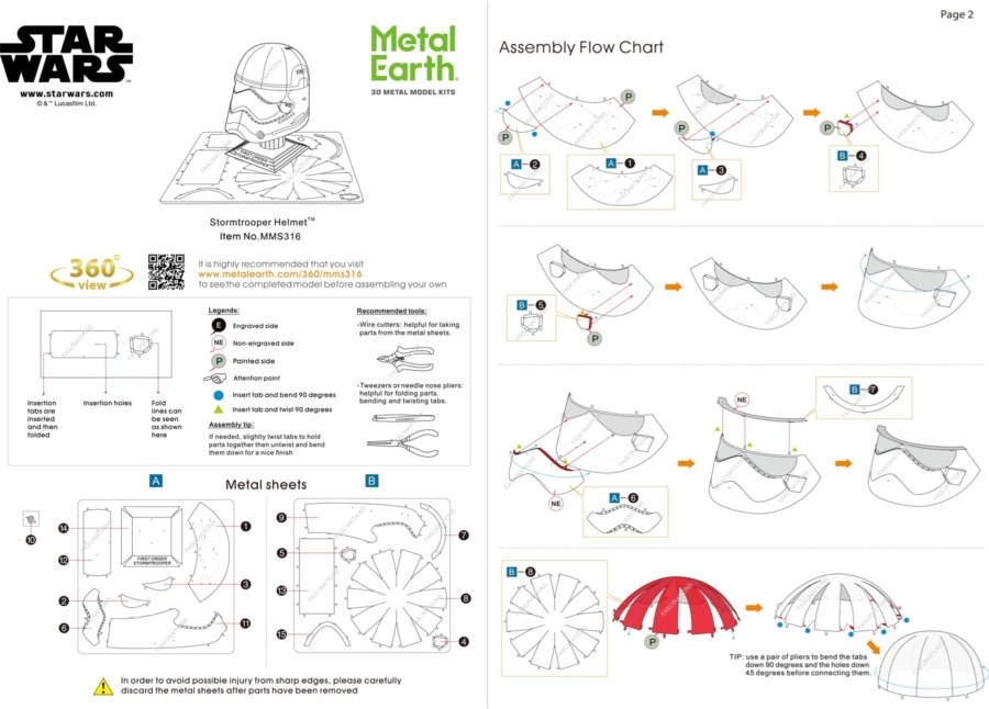 Fjern de enkelte dele fra metalpladerne; brug om nødvendigt en lille bidetang (ikke inkluderet). Delene samles ved hjælp af låse, der består af en tap (krog) og et hul. Bøj tappen med en lille, tynd fladtang (ikke inkluderet), og forbind gradvist alle låse, indtil der opstår et meget realistisk mesterværk!