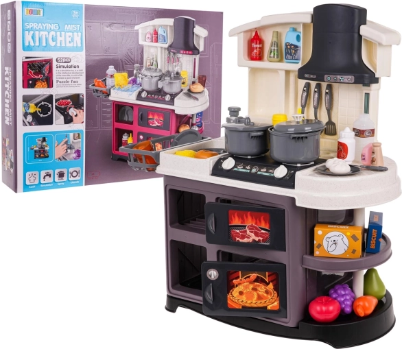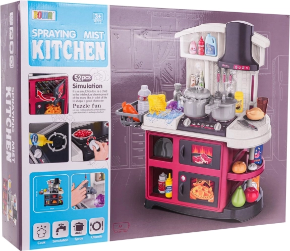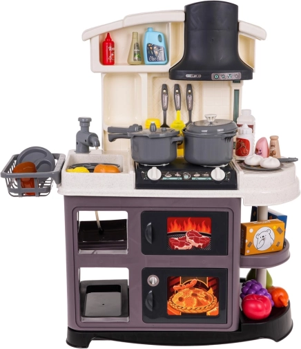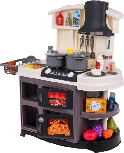 Dette plastkøkken er flot udført og udstyret med alt, hvad børn behøver til madleg. Når man drejer på knapperne, afspilles realistiske lyde af kogning og stegning, og blussene lyser. Ved at tilføje et par dråber vand dannes let kold damp, som forstærker følelsen af rigtig madlavning. Vandhanen løber rigtigt, så børn kan “vaske” op i vasken.