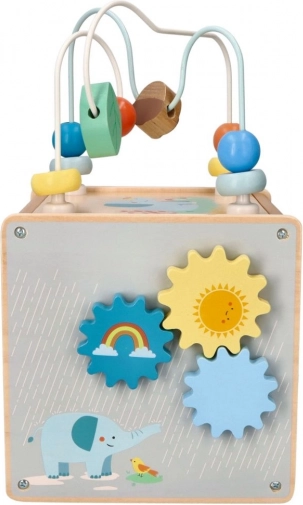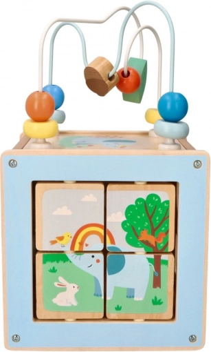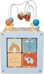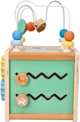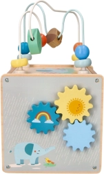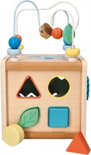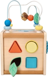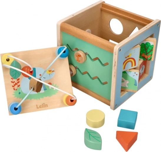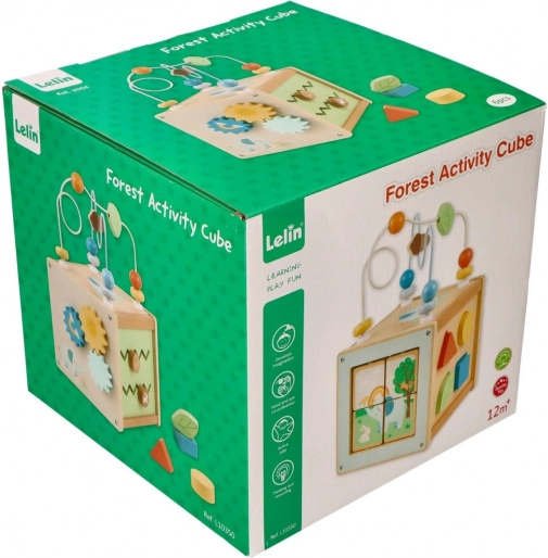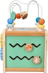 Denne kvalitets aktivitetskubus i træ fra LELIN tilbyder børn et bredt udvalg af aktiviteter på alle sider. Farverige perler på wirer, labyrinter, putteformer og tandhjul fastholder opmærksomheden og udvikler naturligt færdigheder, kreativitet og tålmodighed.