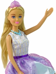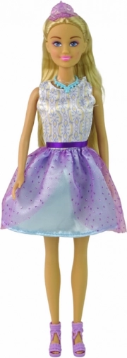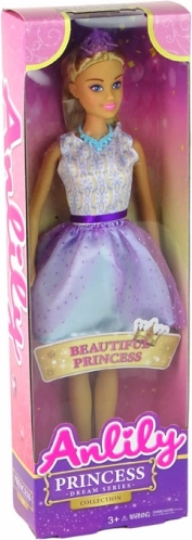 Oplev charmen ved Anlily-dukken i en eventyrlig prinsessestil. Hendes fyldige, let bølgede blonde hår indbyder til at skabe nye frisurer. Kjolen med hvid overdel og lilla‑blå nederdel fuldendes af en glitrende krone, halskæde og høje sko – alt perfekt afstemt for et kongeligt look.