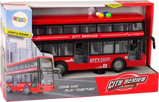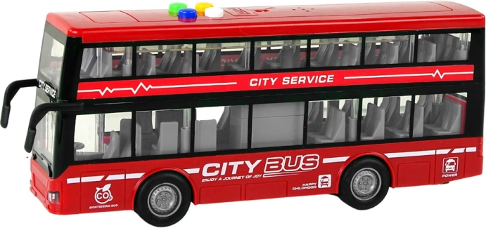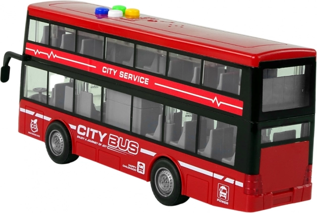 Denne detaljerede toetagers bus i skala 1:16 vil glæde alle små chauffører af offentlig transport. På taget finder du fire interaktive knapper, som aktiverer reelle lyde – horn, baksignal og gadelarm. Interiøret er LED-oplyst og skifter gradvist farve til rød, grøn og blå, hvilket skaber en imponerende stemning under legen.
