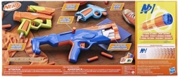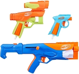 Sættet indeholder tre forskellige blastere i hovedfarverne blå og orange, der tilbyder forskellige spillestile.
