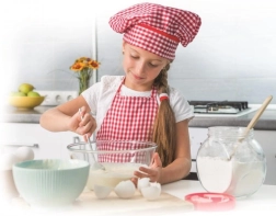 Pige i køkkenet, der legende lærer børn grundlæggende bagning og madlavning.