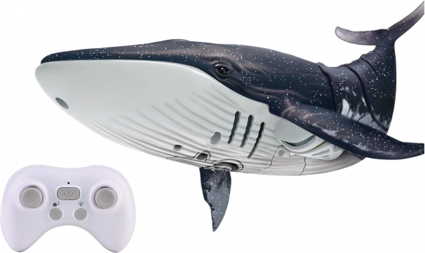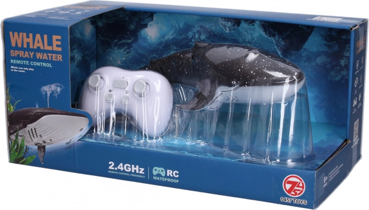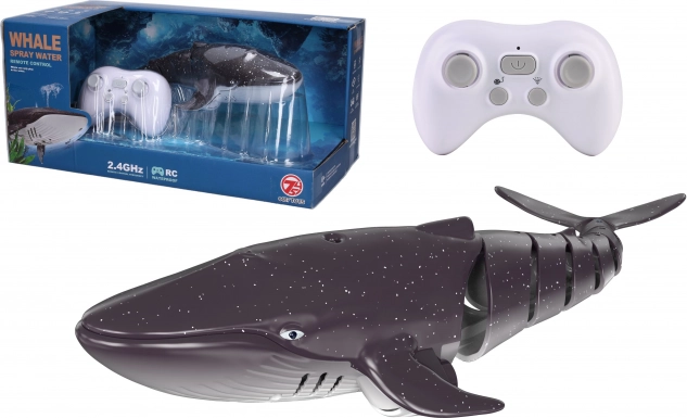 Fjernstyret hval med springvand og lyseffekter. Frekvens 2.4GHz, dimensioner 35x12x8 cm. Perfekt legetøj til sjov!