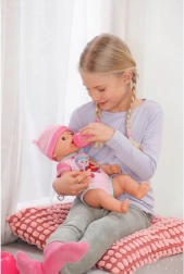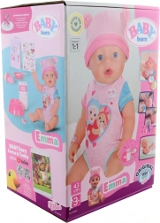 Emma er en yndig BABY born-dukke med realistiske funktioner, som børn elsker. Hun drikker vand fra flasken, og ved at dreje sutten åbner og lukker hun øjnene, hun kan fælde tårer og tisse i bleen eller på potten. Takket være den robuste udførelse klarer hun også et bad, så børn kan have masser af sjov med hende både i og uden for badekarret.