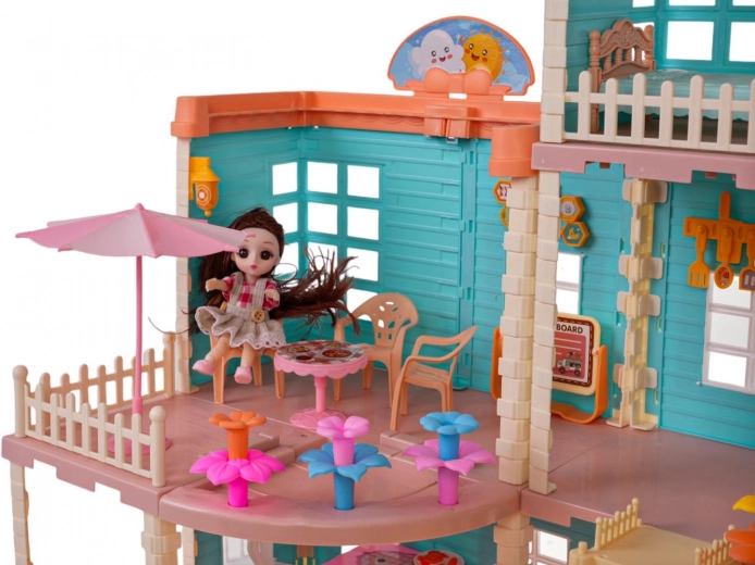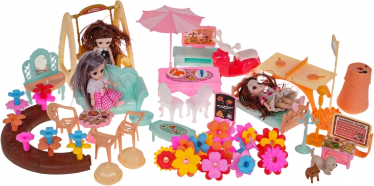 I sættet finder du komplet udstyr inklusive 3 dukker med langt hår velegnet til at børste, møbler og udendørs tilbehør som gynge, parasol og endda et bordtennisbord. Dukkehuset er lavet af kvalitetsplast i levende farver, der fanger opmærksomheden ved første øjekast.
