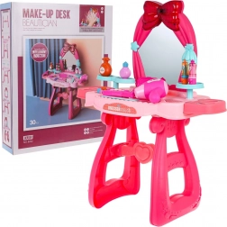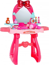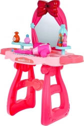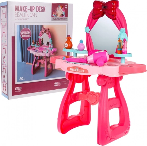 Det stilfulde lyserøde toiletbord med stort spejl og ikonisk sløjfe vil glæde alle børn, der elsker rolleleger. I pakken finder du et rigt sæt tilbehør – fra hårtørrer og glattejern til læbestifter, neglelakker, ringe og armbånd. Spejlet er udstyret med intelligent induktion – ved bevægelse aktiveres lys-effekter og melodier.