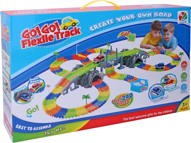 Denne fleksible racerbane begejstrer små racerkørere med uendelige muligheder for opbygning. Takket være de bøjelige dele kan banen nemt bøjes, drejes og bygges om, så børn aldrig keder sig. To gennemkørselstunneler, sporskifte og drejeskive giver mere action og realistiske situationer.