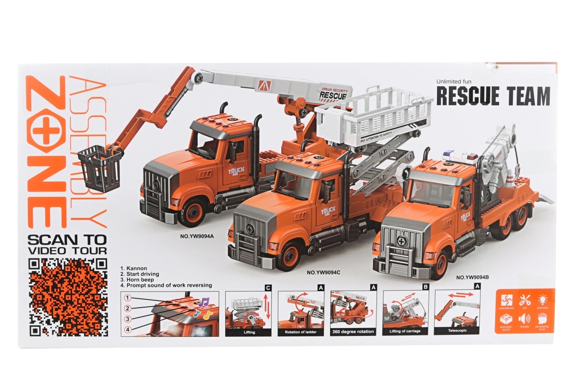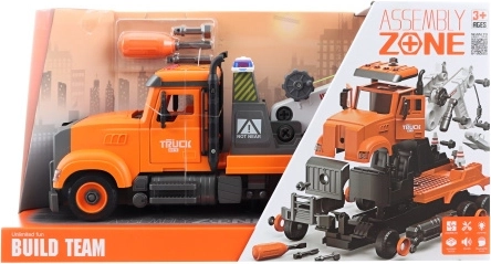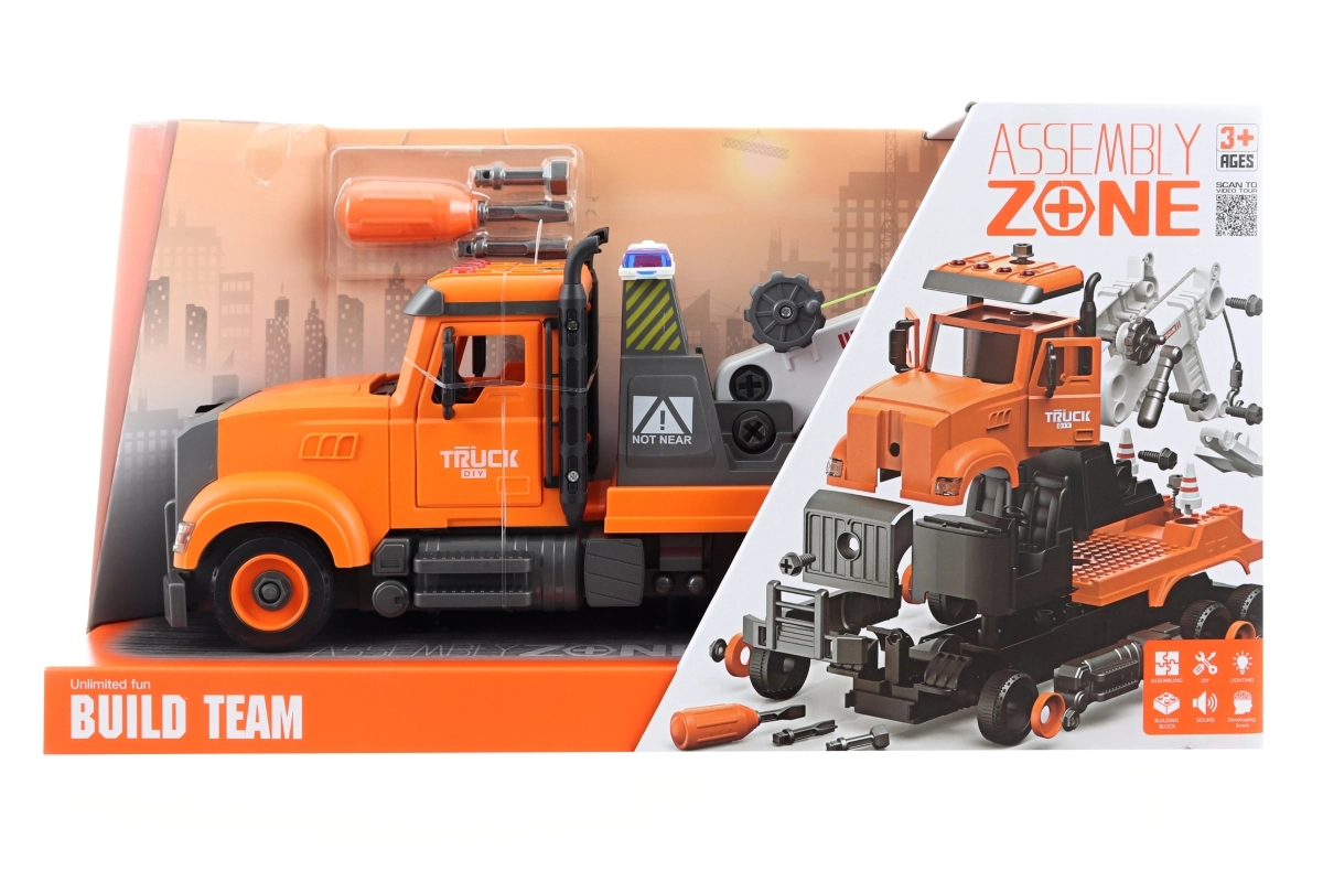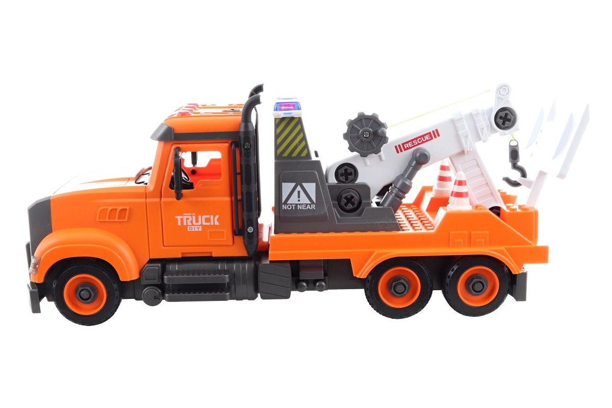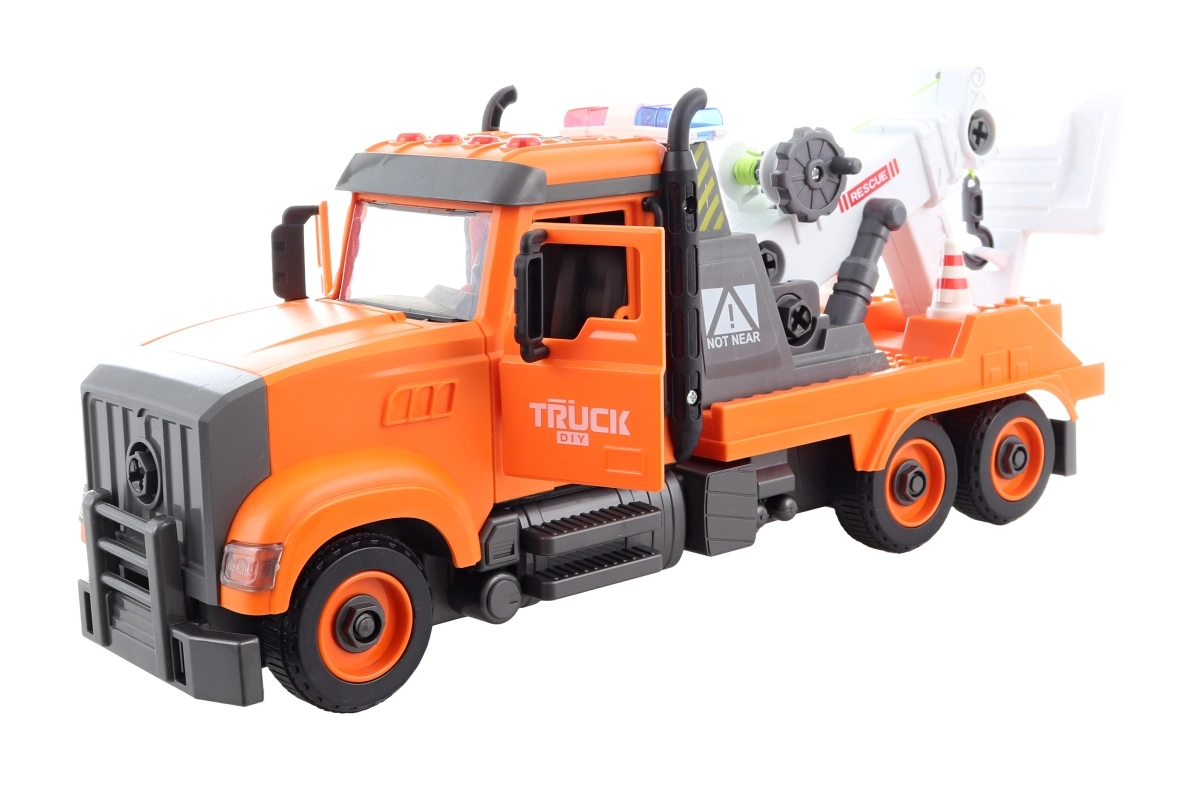 Smuk stor bugseringsvogn med skruemontering. Drives af 3 AG13-batterier, som er inkluderet i pakken. På bilens tag er der 4 knapper med funktioner – start, horn, bip ved bakning og melodier. Bilen har svinghjulstræk. Materiale: plast. Skruetrækker medfølger i pakken. Pakket i en åben æske. Pakkens mål ca. 41×22×13 cm. Bilens mål 36×15×11 cm. Alder 3+
