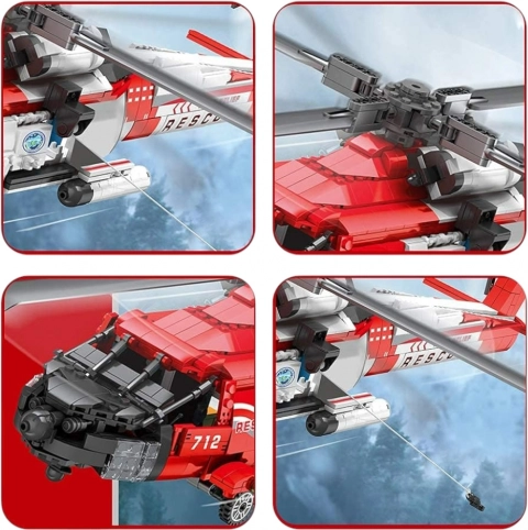 Modellen er udstyret med funktioner som en manuelt roteret halerotor og et udtrækkeligt tov med krog til simulering af redningsaktioner. Indvendigt finder du imitation af redningskabine og instrumentbræt, som understreger autenticiteten. I pakken medfølger også en billedvejledning og klistermærker til det endelige udseende.
