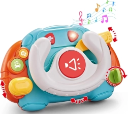 Dette farverige rat er perfekt til børn, der elsker at efterligne kørsel. Realistiske funktioner som drejning af rattet, skift af blinklys og start med nøgle suppleres af lyseffekter og motor-, horn- og musiklyde. Legetøjet er let, kompakt og passer nemt i barnevogn eller rejsetaske.