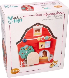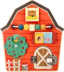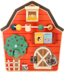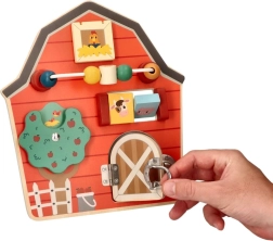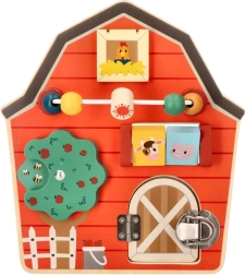 Denne træaktivitetsplade i form af en lade er designet til at stimulere finmotorikken og give børn sjov leg. Med et farverigt gårdtema og livlige farver både underholder og uddanner den familiens yngste. Interaktive elementer som skydende perler, et roterende træ og døre med slå hjælper med at udvikle hånd-øje-koordination.