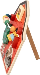 En kreativ og sjov træaktivitetsplade formet som en lade udvikler børns finmotorik og fantasi gennem interaktive elementer.