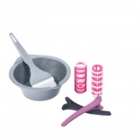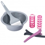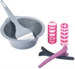 Skål, pensel, klips og hårruller stimulerer fantasien ved “farvning” og formning af frisurer. Sikkert og uden rod.