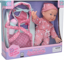 Blød babydukke med bæretaske er det ideelle legetøj til små børn, der gerne vil passe deres dukker. Med en størrelse på 30 cm er den kompakt og let at tage med.