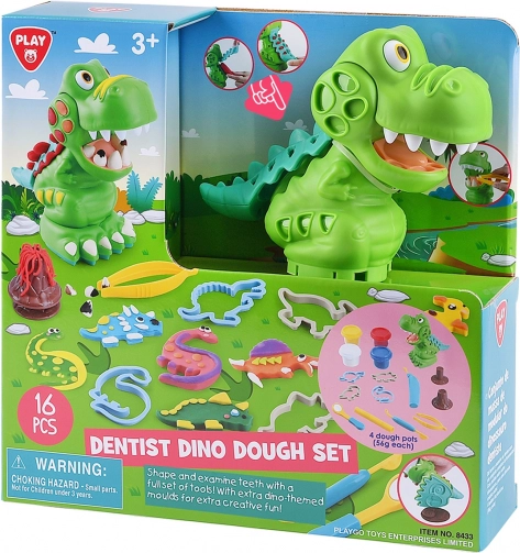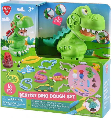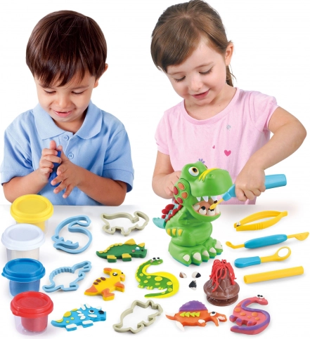 - 4 farverige modelina, dinosaurfigur, 6 forme, 2 tandlægeværktøjer, pincet, kniv, stav