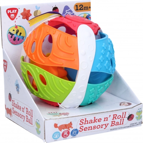 Den sjove Playgo puttekugle med en diameter på 15 cm giver masser af sanseleg til børn fra 12 måneder. Sættet indeholder 2 bløde bolde, som puttes ind i kuglen, samt et bånd med et drejeligt hjul, der ved drejning udsender en klikkende lyd.