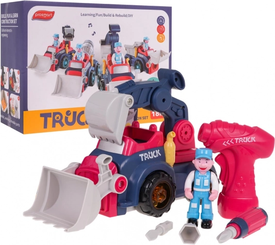 Denne farverige børnegravemaskine er lavet af materialer i høj kvalitet, der er sikre for børn, og imponerer med sine livlige farver. Børn kan igen og igen skille køretøjet ad og samle det ved hjælp af den medfølgende boremaskine/skruetrækker, hvilket træner hånd–øje-koordination og teknisk tænkning. Gravemaskinen kører i alle retninger, undgår forhindringer ved sammenstød og fascinerer med blinkende hjullys og en glad melodi.