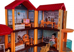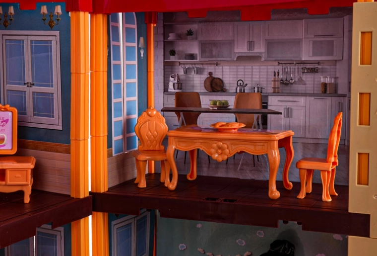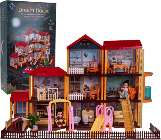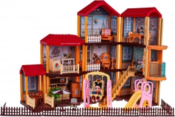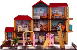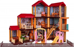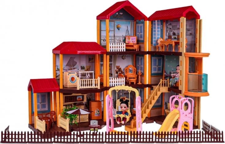 Dette rummelige dukkehus i plast i livlige farver giver børn utallige muligheder for kreativ leg. Interiøret omfatter køkken, badeværelse, musikrum, stue, soveværelse, garderobe og opholdsrum. Rundt om huset er der hegn og en udendørszone med siddeplads, parasol og legeplads med rutsjebane og gynge.