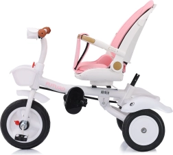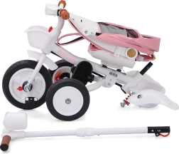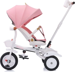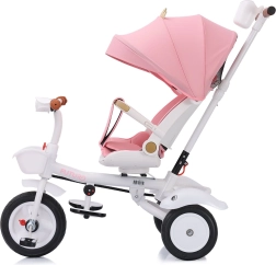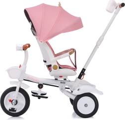 Trehjulet cykel med kaleche 2-i-1 Futuro Princess Chipolino kombinerer komfort, sikkerhed og sjov. Takket være det drejelige sæde (med og mod kørselsretningen), højdejusterbart forældrehåndtag og foldbare elementer tilpasser den sig nemt til både barnets og forældrenes aktuelle behov. Styr med lys og musik gør hver tur til en glædelig oplevelse.