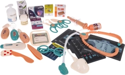Sættet indeholder forskellige lægeværktøjer som stetoskop, termometer, tandlægespejl og mere.
