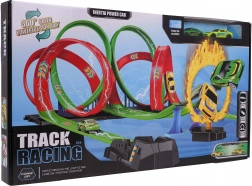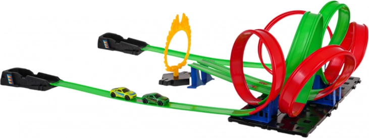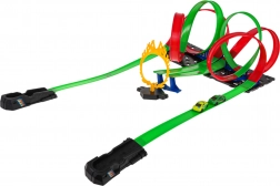 Oplev mega sjov med Børneracerbanen Mega Wyrzutnia Fire Track. Dette sæt kombinerer to parallelle racerbaner, som giver mulighed for dobbelt kapkørsel. Banen er udstyret med lige sektioner til fantastisk fart og med opslugende 360° loops for spændende akrobatiske tricks.