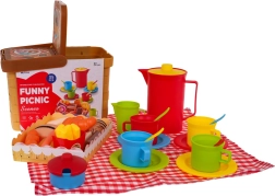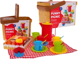 Indhold i sættet: kurv med hank, picnictæppe, bakke af karton, stor og lille kande med tud, 4 tallerkener, 4 kopper, 4 teskeer, gryde med låg, kurv med lækkerier (croissant, 7 småkager, chokolade, vaffel, hotdog, pommes frites og ketchup).