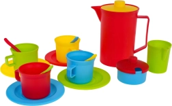 Kopper, tallerkener, teskeer og en tekande er perfekte til et teselskab. Klare farver indbyder til leg og stimulerer fantasien.