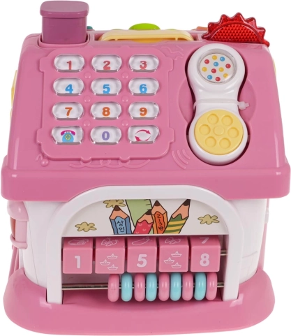Taget rummer en aftagelig telefon, numerisk tastatur og et klaver med otte farvede tangenter, hvor børn kan spille melodier og skifte toner og rytmer. Forsiden har åbningsbare døre med ringelyd og lys, mens sidevæggene byder på alfabetet A–E med udtale på engelsk og navne på former, roterende elementer og en garage med en udtrækkelig lyserød bil.