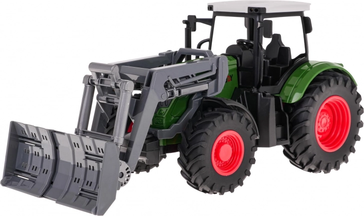 Sjovt og realistisk legetøj til små landmænd: grøn traktor med frontlæsser i skala 1:24. Den har en bevægelig læsser (op/ned, venstre/højre), gummidæk for fremragende greb og frihjul for jævn kørsel. Velegnet til børn fra 3 år, fremstillet af kvalitetsplast i klare farver.