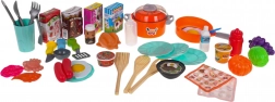 - køkkendelkomponenter, gryde med låg, pande, kop, 4× tallerken, bestik (kniv, gaffel, ske), øse, paletter (inkl. 3× store), kødøkse, tang, skål, legevare (græskar, salat, krabbe, kylling, 2× spejlæg, druer, fisk, pølser, ketchup, æsker med småkager, mælk og is, chokolademælk, instant suppe), menu, klud, pipette til vand, dekorative klistermærker