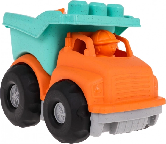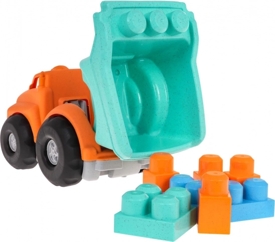 Dumperen og klodserne er lavet af robust bioplast. Materialet er skånsomt mod miljøet og har ingen skarpe kanter, så det er ideelt til små børn.