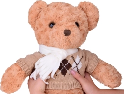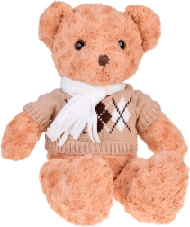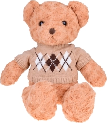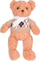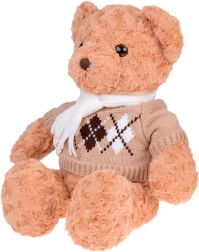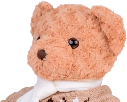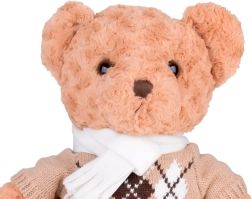 Bjørnens sweater med argyle mønster og flødefarvet halstørklæde giver legetøjet et moderne look. Disse tilbehør øger ikke kun den æstetiske værdi, men fremhæver også dens elegance.